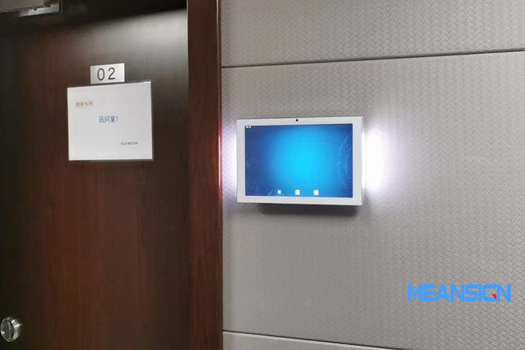 在公司內部每個辦公室、會議室門口,安裝10.1英寸的會議電子門牌,顯示會議室辦公室名稱、企業名稱、日期時間等信息,顯示文字、圖像、音視頻、動畫等信息。發布企業通知公告、企業宣傳片、企業文化、企業活動、培訓信息、優秀員工、公益活動、節日主題氛圍、參觀視察、溫馨提示等。